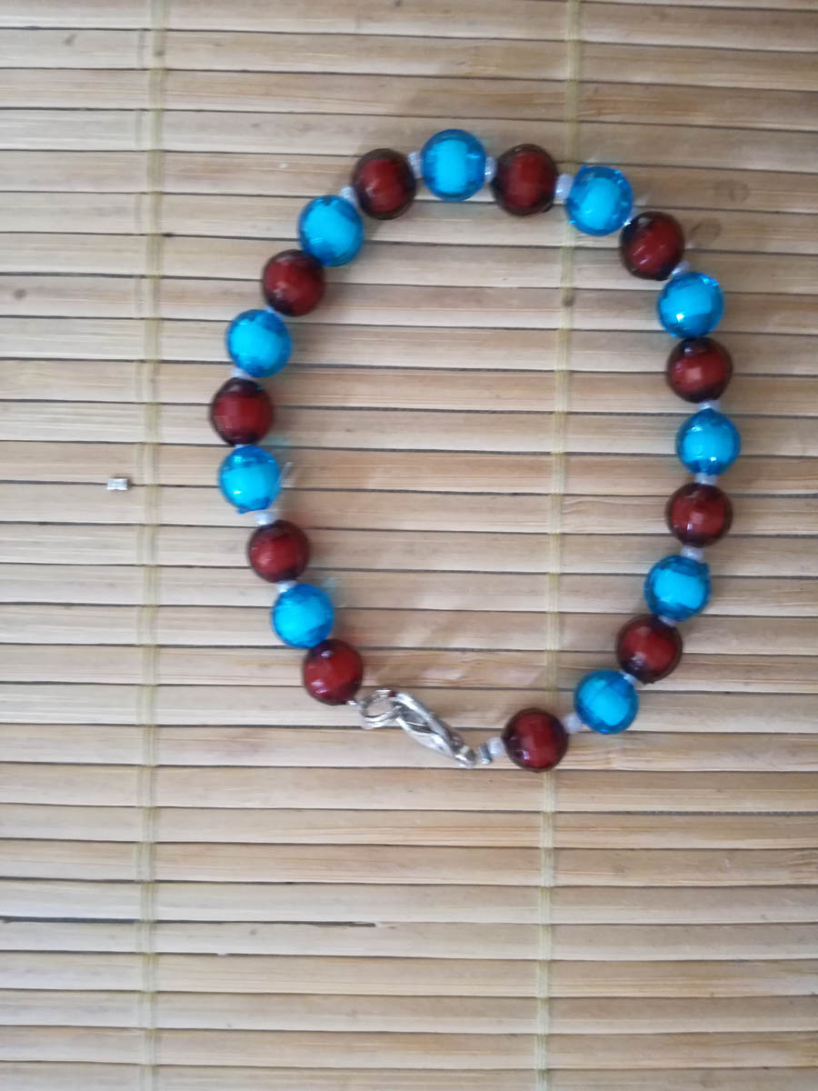 Collier sautoir avec bracelet assorti. Fermeture réglable, perles en pierre. Tons turquoises et bruns.